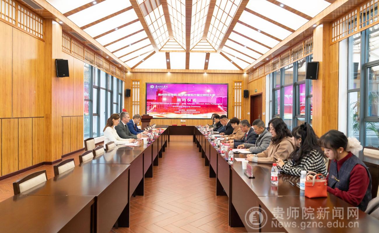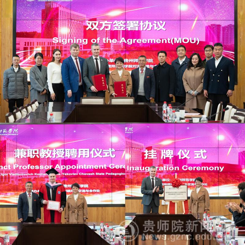 On December 15, a delegation led by the Rector of Chuvash State Pedagogical University of Russia visited our university for a signing ceremony, held in the Landscape Lecture Hall on the first floor of Yinshan Academy. Attending the ceremony were Igor Vladimirovich Kozhanov, Rector of Chuvash State Pedagogical University of Russia; Wang Shuqian, President of Guizhou Education University; and Zhao Shouying, Member of the University Party Standing Committee and Vice President ( the Director-Generallevel). Also present were Kirillov Alexander Alekseevich, Head of Science and Innovation Department at Chuvash State Pedagogical University of Russia; Russian language teacher Popova Daria Yuryevna; Du Hongbo, Director of the Academic Affairs Office and Dean of the Innovation and Entrepreneurship School of our university; Ma Guanhui, Dean of the School of Music and Dance; Song Wanju from the School of Education Science; Zhang Bin, Deputy Director (in charge) of the International Office ; and LuoYong, Vice Dean of the School of Foreign Languages. The ceremony was presided over by Zhao Shouying.
